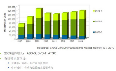 STB 2009年逆勢增長。大城市發(fā)展方向是高清和雙向機(jī)頂盒;中小城市是STB的成長主力。