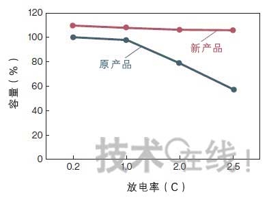 新產(chǎn)品不但容量大,大電流下的充放電特性也十分出色。充電時間可比原產(chǎn)品縮短約30%。放電方面,即使在2.5C的放電率下容量也不會降低,可用于高輸出產(chǎn)品(圖2)注1)。