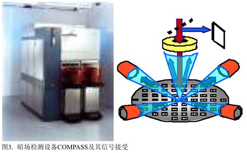暗場檢測技術(shù)作為檢測晶片缺陷的有效手段之一,其優(yōu)點(diǎn)在于以下幾個(gè)方面:首先,在暗場獲得圖像的灰階易于控制和調(diào)節(jié)。暗場是位于硅片上方和硅片成30度角的區(qū)域,在此區(qū)域內(nèi)獲得的圖像灰階,可以通過調(diào)節(jié)激光的能量和探測器的敏感度來輕松控制;其次,在暗場內(nèi),可以很容易地辨認(rèn)有具體形態(tài)和位于硅片表面的缺陷,比如刮傷、微粒之類的缺陷;最后,使用暗場的檢測速度非???,成本相對比較低,通常被用作快速分析影響產(chǎn)量的各類缺陷超出界定值的問題,AIT和COMPASS是在半導(dǎo)體制造企業(yè)廣泛應(yīng)用的暗場檢測設(shè)備(如圖2和3所示)。[page]