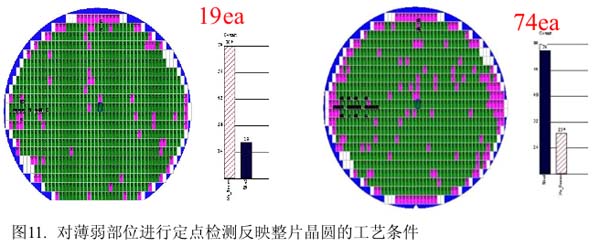 最終的實(shí)驗(yàn)證明自動(dòng)工藝檢測結(jié)果與最終良率的對應(yīng)關(guān)系。表明自動(dòng)工藝檢測可以反映存儲(chǔ)單元內(nèi)接觸孔通孔刻蝕的狀態(tài)。對于在生產(chǎn)線上檢驗(yàn)到薄弱部位有刻蝕不完全比較多的晶圓,其對應(yīng)的正常存儲(chǔ)單元內(nèi)也有較多的接觸孔有刻蝕不完全問題??梢酝ㄟ^對產(chǎn)品的薄弱部位進(jìn)行監(jiān)測達(dá)到對正常存儲(chǔ)單元內(nèi)接觸孔刻蝕狀態(tài)的實(shí)時(shí)反映,這對接觸孔的刻蝕工藝改進(jìn)有極大的促進(jìn)作用(如圖11所示)。