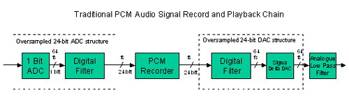 數(shù)字音頻的最常見數(shù)據(jù)格式是脈沖編碼調(diào)制(PCM)。CD使用以44.1kHz采樣頻率錄制的16位PCM數(shù)據(jù),DVD-Audio盤也使用PCM數(shù)據(jù)格式,因此用來處理DVD-Audio數(shù)據(jù)的技術(shù)與CD是一樣的。典型的系統(tǒng)架構(gòu)如下圖所示。注意:在sigma-deltaDAC之前,有一個數(shù)字濾波器用來處理過采樣和防止圖像抖動。