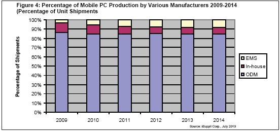 圖4所示為iSuppli公司對移動PC產(chǎn)量份額的預(yù)測,按制造商類型細分。