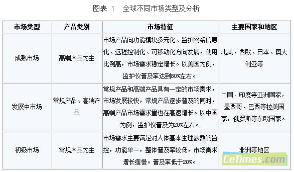 醫(yī)療設(shè)備的發(fā)展與國家和地區(qū)的經(jīng)濟發(fā)展水平、醫(yī)療政策以及當?shù)鼐用袷杖胨较⑾⑾嚓P(guān),這些因素導致全球醫(yī)療監(jiān)護儀市場發(fā)展不平。根據(jù)市場特征以及對產(chǎn)品需求的不同可以將醫(yī)療監(jiān)護儀市場分為成熟市場、發(fā)展中市場和初級市場。