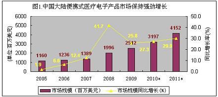 2005-2009年,中國大陸便攜式醫(yī)療電子產(chǎn)品市場呈現(xiàn)出加速增長勢(shì)態(tài),年復(fù)合增長率高達(dá)30.8%,幾乎沒有受到金融危機(jī)的影響。2009年市場總規(guī)模達(dá)到25.12億美元,增長速度達(dá)到25.8%占醫(yī)療電子產(chǎn)品總市場的53.2%。在便攜式醫(yī)療電子市場中,家用的占六成以上的份額,電子血壓計(jì)、便攜式血糖儀和電子助聽器占據(jù)了90%以上的銷售份額。由于目前市場處于普及的初級(jí)階段,中國人口基數(shù)大,國人健康意識(shí)的提升,整個(gè)便攜式醫(yī)療電子市場需要面對(duì)的是中國內(nèi)需市場,不存在市場飽和所謂的受金融危機(jī)影響。所以家用便攜式醫(yī)療電子產(chǎn)品市場前景非常好,便攜式、信息化、低功耗、低成本以及安全性是市場關(guān)注的熱點(diǎn)。展望未來,中國便攜式醫(yī)療電子市場前景非常誘人,在未來兩年,中國便攜式醫(yī)療電子產(chǎn)品市場規(guī)模年復(fù)合增長率可接近30%,2010年市場規(guī)模將接近32億美元,2011年會(huì)超過40億美元。(見下圖)。
