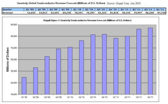 Ford認為,在上個月聽到的最多詞匯是全球經(jīng)濟及半導體業(yè)可能進入兩次探底 (double dip)。由于近期半導體市場的增長超出業(yè)界的預期,因而有些理性的思考者擔心市場的持久性是可以理解的,但是,iSuppli并不認同兩次探底的說法,并認為自2010下半年開始全球半導體業(yè)將回到正常增長的軌道中來。2011年仍有7%的增長。
