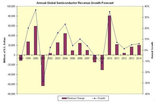 當2010年的增長與2000年相比時,要清楚此波周期的性質(zhì)與2000年時有明顯的不同,這是十分重要的。2000年的增長是由于1999年的產(chǎn)能迅速擴充以及不能持久的網(wǎng)絡泡沫增長來推動,所以2001年泡沫破裂,導致半導體業(yè)下降28.6%。相比2010年的增長是由于受2009年的外力突然打擊,產(chǎn)業(yè)自身增長的動力暫時被壓抑,因而在2010年半導體產(chǎn)業(yè)能迅速回復,包括在2011年能繼續(xù)增長。