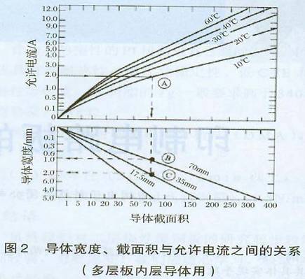 值得注意的是,當(dāng)導(dǎo)體圖形溫度上升到85℃左右時,絕緣材料自身開始發(fā)黃(圖1),電流繼續(xù)通過,最后銅圖形熔斷,特別是多層板內(nèi)層圖形,周圍都是傳熱性差的樹脂,散熱困難,因而溫度不可避免地上升,所以特別要注意導(dǎo)體圖形線寬的設(shè)計。實(shí)際上在進(jìn)行PCB布線設(shè)計時走線線寬主要依據(jù)其發(fā)熱量和散熱環(huán)境來確定的。銅導(dǎo)體的截面積決定了導(dǎo)線電阻(數(shù)字電路中線電阻引起的信號損耗可忽略不計),銅導(dǎo)體和絕緣基材的導(dǎo)熱率影響溫升,進(jìn)而決定載流量。圖2是普通FR-4覆銅箔板銅導(dǎo)體圖形線寬及截面積與允許電流之間的關(guān)系圖。從圖中可以看出:導(dǎo)體圖形截面積一定,當(dāng)其允許電流值為2A,溫度上升值低于10℃時,對于35Um銅箔,其線寬應(yīng)設(shè)計為2mm:對于70um銅箔,其線寬應(yīng)設(shè)計為lmm。由此得出:當(dāng)導(dǎo)體的截面積、允許電流和溫度上升值一定時,可通過增加銅箔厚度或加大線寬值兩個方面來滿足走線的散熱要求。