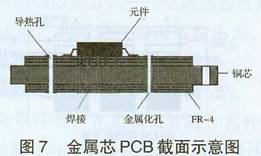金屬板嵌入多層印制板的中間,其典型結(jié)構(gòu)如圖7金屬芯板本身也可作為地層使用,其上下層可通過金屬化孔(與芯板絕緣)互聯(lián),并通過導(dǎo)熱孔實(shí)現(xiàn)熱量在金屬芯板內(nèi)層和表面的傳遞。如圖7所示,發(fā)熱元件可通過底部和導(dǎo)熱孔直接焊接在板面上,發(fā)熱器件產(chǎn)生的熱直接傳遞到金屬芯板,由金屬芯板經(jīng)導(dǎo)熱孔傳給接觸的安裝機(jī)箱而散發(fā)出去;熱量較大時可銑去芯板兩邊的絕緣層,通過邊緣裸露的金屬芯板與機(jī)座接觸散熱,因此具有良好的散熱效果。對處于密閉機(jī)箱中的電路散熱是一種較好的選擇金屬芯PCB的芯材通常有鋁、銅、鋼等,后來開發(fā)出了覆銅因瓦復(fù)合材料(CIC),它不僅具有良好的導(dǎo)熱性,而且其熱膨脹系數(shù)與半導(dǎo)體器件匹配性好,所制成的CIC金屬芯板可應(yīng)用于要求高可靠性、高組裝密度、高功率、高性能的軍用電子設(shè)備中。