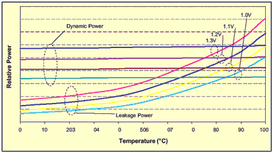 如圖1所示,功耗很大程度上取決于電源電壓和溫度。降低FPGA電源電壓可使動態(tài)功耗呈二次函數(shù)下降,漏電功耗呈指數(shù)下降。升高溫度可導(dǎo)致漏電功耗呈指數(shù)上升。例如,把溫度從85℃升高至100℃可使漏電功耗增加25%。