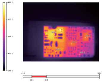 圖6~9是利用Ti20拍攝的金升陽(yáng)公司12W產(chǎn)品的熱圖像。通過這些圖片,我們不僅可以清晰地看出整體的熱分布(相同的溫度,所用的顏色是一致的),還可以借助其提供的軟件分析每一個(gè)元器件此時(shí)對(duì)應(yīng)的溫度值,如幾個(gè)溫度相對(duì)較高的元器件的溫度值分別如表1所示。
