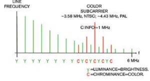 在最初的開發(fā)階段,電視機(jī)僅支持單色(即黑白)圖像的播放和顯示。隨著技術(shù)的發(fā)展,也支持彩色電視廣播,但仍然需要保持黑白電視顯示設(shè)備的向后兼容性。電視機(jī)需要在可用帶寬范圍內(nèi)容納顏色信息,并如同早期電視那樣的格式繼續(xù)顯示無(wú)失真的黑白畫面。