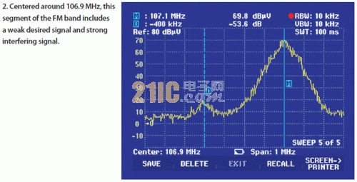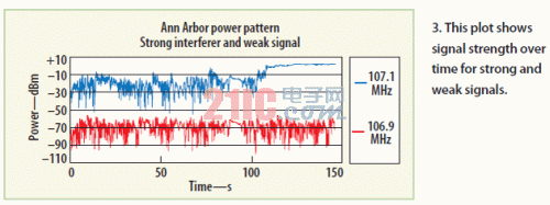 圖1顯示了這次在地圖上的測試行駛,其中3kW的發(fā)射機(jī)架在高大建筑物的樓頂。雖然天線在直接視線范圍內(nèi),但干擾源處于峰值水平,接收到的106.7MHz目標(biāo)頻率信號質(zhì)量下降嚴(yán)重。圖2顯示了信號強(qiáng)度的典型頻譜,圖3顯示了測試行駛期間2個信號的強(qiáng)度。