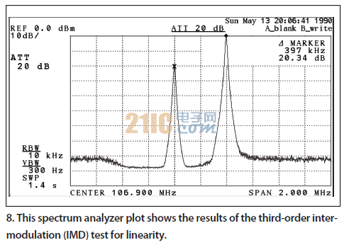 在使用系統(tǒng)之前要對測量裝置進(jìn)行測試,以便確認(rèn)測量裝置不會引起任何可能降低測量精度的顯著噪聲或失真。還要通過調(diào)整相對的插入值對功率電平進(jìn)行校準(zhǔn)。指定電平在合成器輸出端——收音機(jī)天線連接點(diǎn)進(jìn)行測量。線性度在要求的信號電平之上測量,要做到這一點(diǎn),必須將兩個發(fā)生器在各自頻率處設(shè)為CW模式,并且總功率電平要超過測試案例中使用的值。參考圖8,發(fā)生器1被設(shè)為0dBm,發(fā)生器2被設(shè)為-20dBm。這里沒有可測量的三階互調(diào)(IM3)。圖7描述了被設(shè)為接近最大測試條件的信號。