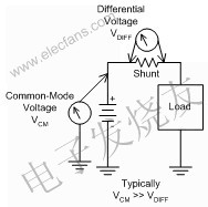 負(fù)載或電源的低壓側(cè)或高壓側(cè)都可進(jìn)行電流檢測(cè)。共模電壓是指分路(shunt)上的電壓(不是分路上的差分電壓),在低壓側(cè)檢測(cè)為零伏。低壓側(cè)檢測(cè)最簡單,可采用最基本的放大器電路。低壓側(cè)檢測(cè)的難點(diǎn)在于:低壓側(cè)檢測(cè)會(huì)影響系統(tǒng)的接地端,可能還需要增加更多的線路,而且這種作法通常不利于故障診斷。圖1中的高壓側(cè)分路放大器可檢測(cè)很高的電源電壓上極低的差分電壓(通常為100mV或更低),通常在車載應(yīng)用中為13.8V。不過,如果為無限制的(unconditioned)電池線路,那么會(huì)受瞬變影響:如果無意中將電池方向放錯(cuò)就會(huì)出現(xiàn)–13.5V的情況,如果出現(xiàn)負(fù)載突降或感應(yīng)反沖,那么最大瞬變可達(dá)72V。不妨設(shè)想,放大器通常采用5~12V的單電源供電(5V的電源供電日益常見),這就需要放大器的輸入引腳連接到共模電位,大大超過了放大器電源軌的限制。