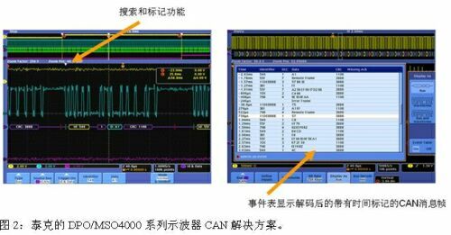對于汽車中常用的CAN、LIN這類低速串行總線的調試,泰克的DPO/MSO4000系列示波器提供了簡單、易用、完整、高品質的觸發(fā)、捕獲和解碼解決方案。如圖2,該示波器系列提供了搜索和標記功能,可在事件表顯示解碼后的帶有時間標記的CAN消息幀,這一功能是其他競爭性產品所不具備的。