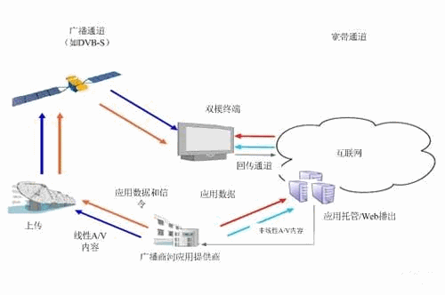 對(duì)運(yùn)營(yíng)商而言,數(shù)字電視數(shù)據(jù)業(yè)務(wù)可能來(lái)源于廣播信道(衛(wèi)星、有線或無(wú)線等)和/或?qū)拵诺溃ɑヂ?lián)網(wǎng)、或其它的IP通道)的信號(hào),音視頻與數(shù)據(jù)可以不加區(qū)分地由這兩個(gè)通道分別接入,在帶寬限制的情況下,廣播通道可以用來(lái)播送高清節(jié)目,而寬帶的使用形式就會(huì)有很廣,如視頻點(diǎn)播、時(shí)移、信息瀏覽、電子商務(wù)等。