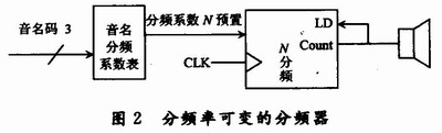 因此若采用模值和輸入脈沖頻率都可控的計(jì)數(shù)器實(shí)現(xiàn)信號分頻,可根據(jù)音程碼選擇分頻計(jì)數(shù)器的輸入脈沖頻率fs、根據(jù)音名碼控制分頻計(jì)數(shù)器的模值N,如圖2所示。