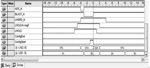 圖4中ADS_N、BLAST_N、LWORD_N、LHOLD、LHOLDA是LocalBus的接口信號(hào),ConfigEnd和ConfigStart是分別代表配置結(jié)束和配置開始的標(biāo)志寄存器,LA是接口的地址信號(hào),用于模塊中控制寄存器的尋址,LD是接口的數(shù)據(jù)信號(hào),用于指令數(shù)據(jù)的發(fā)送和數(shù)據(jù)的回收。