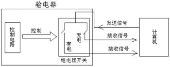 前文中信號是通過驗電器裝置發(fā)送到計算機,此時就遇到一個共地線問題,要讓計算機正確地識別驗電器傳送過來的信號就必須使計算機和驗電器共一個地線,否則,會因傳送線路過長不共地線而導致計算機識別信號出錯。本文改變信號傳送方式,如圖2所示,由計算機發(fā)送信號,驗電器內部通過繼電器開關來控制有電或無電線路的導通或斷開,計算機接收由自己發(fā)送的經過繼電器開關送來的兩路信號,若有電線路送來高電平信號,則無電線路送來低電平,此時高壓線有電;若無電線路送來高電平信號,則有電線路送來低電平,高壓線無電,若兩路線路都送來高電平信號或低電平信號則電路出錯。