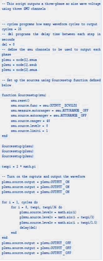 這部分包含許多腳本例子說明吉時利支持腳本的儀器的一些特點。圖1示出了兩臺吉時利系統(tǒng)源表如何使用單腳本控制產(chǎn)生3相交流波形。在這個例子中,使用吉時利的TSP-Link技術(shù)連接這兩臺儀器,因而很容易用腳本控制這兩臺儀器。