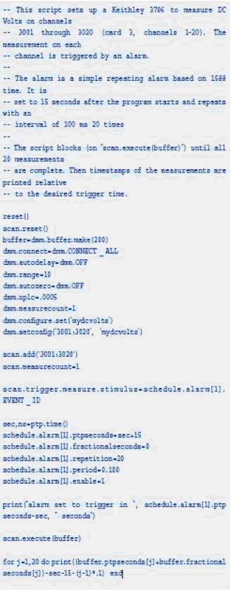 圖2說明了基于LXI Class B技術(shù)的定時器如何控制腳本工作。在此腳本中,吉時利3706型LXI Class B儀器使用基于IEEE 1588的計時器排列一系列測量的順序。LXI Class B的定時特點特別適合避免或最小化由延遲或通信時延導(dǎo)致的系統(tǒng)時延。