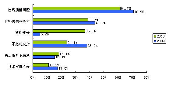 在缺貨的大環(huán)境下,不少電子系統(tǒng)制造商被迫更換供應(yīng)商。導(dǎo)致合格供應(yīng)商降級(jí)的最主要因素依次是物料出現(xiàn)質(zhì)量問(wèn)題、價(jià)格失去競(jìng)爭(zhēng)力和貨期變長(zhǎng)。物料質(zhì)量問(wèn)題在任何情況下都是不可妥協(xié)的;價(jià)格失去競(jìng)爭(zhēng)力也就是價(jià)格上漲壓縮了下游公司的利潤(rùn)空間;而貨期變長(zhǎng)導(dǎo)致供應(yīng)商降級(jí)的比例變化最顯著,由2009年的5.2%大幅上升至2010年的36.8%——這是供應(yīng)鏈調(diào)整的表現(xiàn)。因此,系統(tǒng)廠商在考察新供應(yīng)商時(shí),除了考察物料質(zhì)量因素外,產(chǎn)品性價(jià)比和供貨能力也是重要的考慮因素。