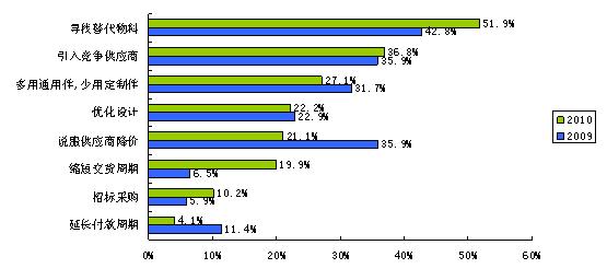 在缺貨漲價(jià)的氣氛中談COSTDOWN注定是個(gè)艱難的過(guò)程。調(diào)查中顯示,2010年最主要的COSTDOWN方式是尋找替代物料和引入競(jìng)爭(zhēng)供應(yīng)商。與2009年相比,尋找替代物料依然是最重要的COSTDOWN方式,但采取說(shuō)服供應(yīng)商降價(jià)這種方式的人少了許多,由35.9%降至21.1%,其中,2億營(yíng)業(yè)額以上的大公司在砍價(jià)方面顯然更有話語(yǔ)權(quán)。