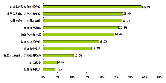 為了應(yīng)對(duì)采購(gòu)風(fēng)險(xiǎn),采購(gòu)商采取了綜合的應(yīng)對(duì)措施,其中最主要的三種方式是:選擇生產(chǎn)資源好的供應(yīng)商、采用多品牌多供應(yīng)商策略、多用通用件少用定制件。不同營(yíng)業(yè)規(guī)模和不同終端產(chǎn)品的公司也表現(xiàn)出各自不同的應(yīng)對(duì)措施。更多詳細(xì)內(nèi)容請(qǐng)關(guān)注電子元件技術(shù)網(wǎng)出版的《2011供應(yīng)商管理調(diào)查報(bào)告》。