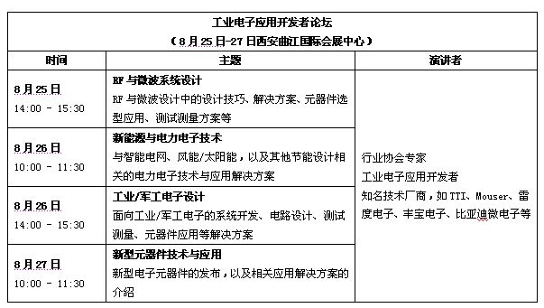 作為2011西部電子論壇中的一個(gè)新環(huán)節(jié),論壇組委會(huì)將聯(lián)合2011中國(guó)(西安)電子展,同期展會(huì)2號(hào)館推出工業(yè)電子應(yīng)用開發(fā)者論壇,該活動(dòng)是2011中國(guó)(西安)電子展中的核心活動(dòng)之一,聚焦以西安為中心的電子行業(yè)最為關(guān)注的RF微波、新能源以及工業(yè)應(yīng)用等主題,邀請(qǐng)研發(fā)一線的工程師與領(lǐng)先的技術(shù)廠商代表同臺(tái)展示設(shè)計(jì)新技術(shù)、新思路、新方案,為工業(yè)電子應(yīng)用開發(fā)者提供深入、平等交流的機(jī)會(huì)。
