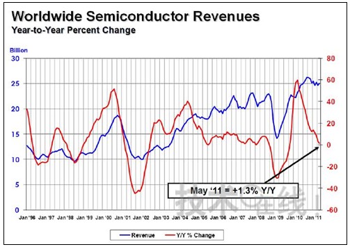 美國半導(dǎo)體工業(yè)協(xié)會發(fā)布的資料顯示,2011年5月份的全球半導(dǎo)體銷售額為250億300萬美元(3個月的移動平均值。下同)。比上年同月僅增長1.3%,與上個月相比,也只增長1.8%。