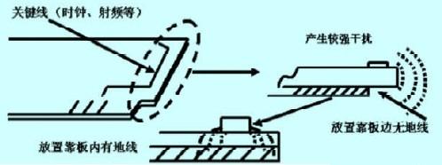 印制電路板的板邊處理是否合理, 決定著是否能夠更加有效地抑制信號(hào)的對(duì)外干擾。為防止高速數(shù)字電路通過(guò)板邊對(duì)外干擾, 應(yīng)該嚴(yán)格控制其布線位置, 讓其盡量靠近印制板內(nèi)部。高頻等干擾較強(qiáng)信號(hào)線不應(yīng)該走到板的邊緣, 以防止無(wú)對(duì)應(yīng)地層耦合回路, 產(chǎn)生信號(hào)對(duì)外的干擾泄漏, 如圖3 所示: