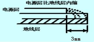 對(duì)于高速數(shù)字電路板應(yīng)該采用多層板, 以減小環(huán)路面積, 將中間層作為電源或地層, 并且盡量保證電源與地相鄰的層間距盡量小;讓每一信號(hào)層都有一對(duì)應(yīng)的地線層, 信號(hào)線與其地回路構(gòu)成的環(huán)面積要盡可能小, 環(huán)面積越小, 對(duì)外的干擾越少。針對(duì)這一特點(diǎn), 在地平面分割時(shí), 要考慮到地平面與重要信號(hào)走線的分布, 防止由于地平面開(kāi)槽等帶來(lái)的問(wèn)題,信號(hào)線不能跨越地平面和電源平面分隔區(qū), 防止形成大的地線回路。同時(shí)電源層應(yīng)該比地線層內(nèi)縮3 m m 左右的距離, 這樣將能夠抑制70% 以上的電源干擾。如圖2 所示。