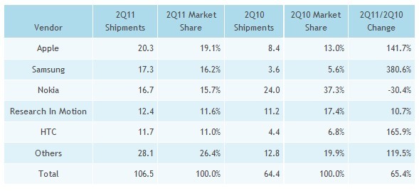 - 2011年第二季智能手機(jī)市場成長了65.4%