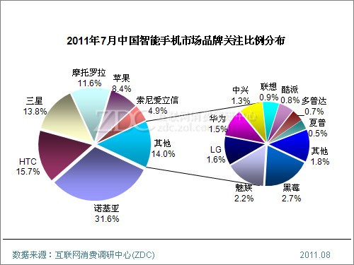 (圖) 2011年7月中國智能手機(jī)市場品牌關(guān)注比例分布[page]