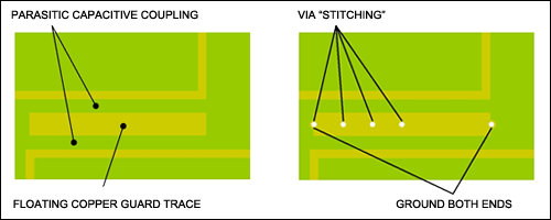 填充地也稱為保護(hù)線,通常將其用于電路中很難鋪設(shè)連續(xù)接地區(qū)域或需要屏蔽敏感電路的設(shè)計(圖10)。通過在引線兩端,或者是沿線放置接地過孔(即過孔陣列),增大屏蔽效應(yīng)。請不要將保護(hù)線與設(shè)計用來提供返回電流通路的引線相混合,這樣的布局會引入串?dāng)_。