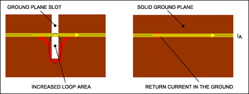 返回電流通路須盡可能靠近主電流通道,將輻射磁場降至最小。這種布局有助于減小電流環(huán)路面積。返回電流的理想低阻通路通常是引線下方的接地區(qū)域—將環(huán)路面積有效限制在電介質(zhì)厚度乘以引線長度的區(qū)域。但是,如果接地區(qū)域被分割開,則會增大環(huán)路面積(圖3)。對于穿過分割區(qū)域的引線,返回電流將被強(qiáng)制通過高阻通路,大大提高了電流環(huán)路面積。這種布局還使電路引線更容易受互感的影響。