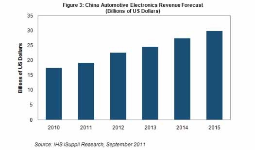 據(jù)IHS iSuppli公司的中國研究報(bào)告,2011年中國汽車電子市場銷售額預(yù)計(jì)將達(dá)到192億美元,比去年的175億美元增長9.7%。