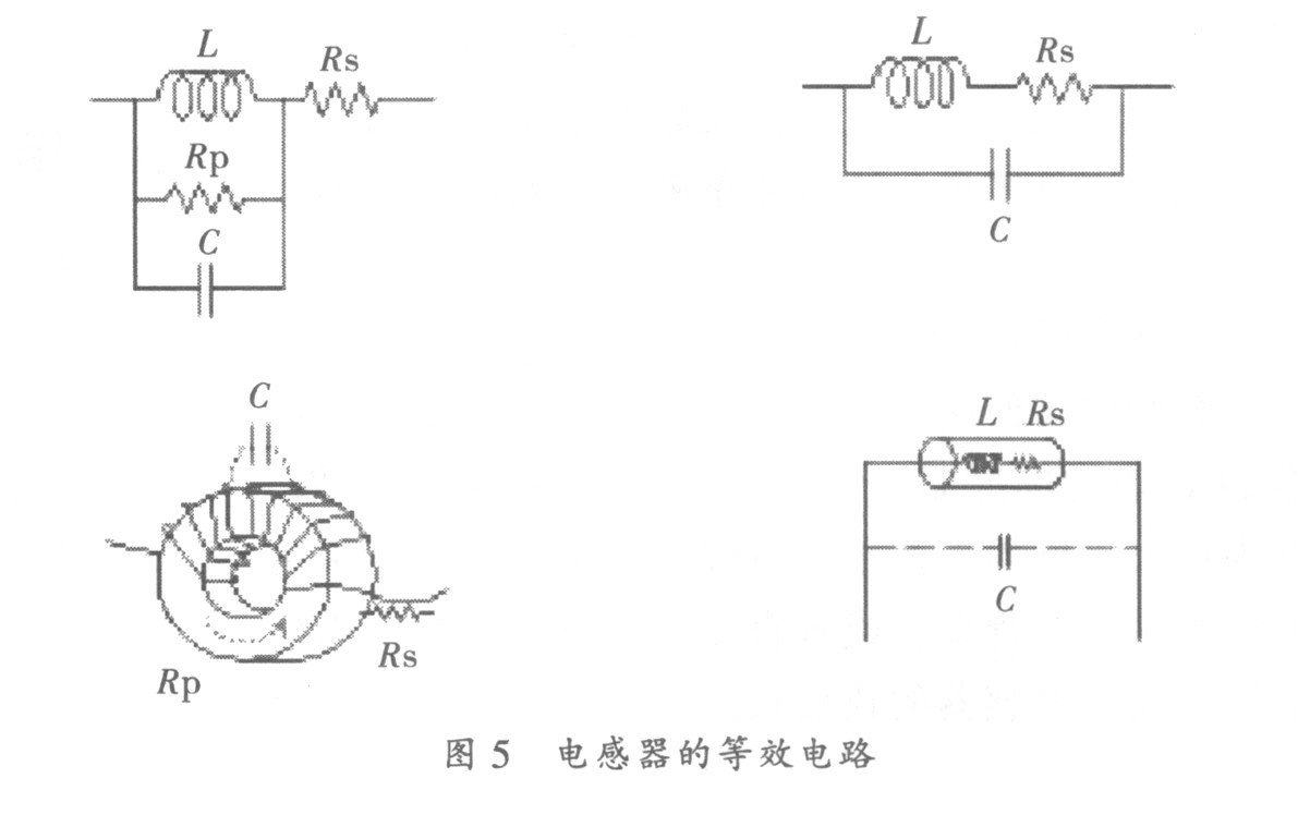 電感器由纏繞在磁芯上的導(dǎo)線構(gòu)成, 其特性則由所使用的磁芯材料決定??諝馐菢?gòu)成電感器最簡(jiǎn)單的磁性材料, 但為使電感器具有更高的電感量,經(jīng)常用鐵、鐵氧體等磁性材料做磁芯。電感器的典型等效電路如圖5 (a) 所示, 圖中Rp 代表磁性的鐵耗, Rs 代表導(dǎo)線的銅耗, C 是繞線間的分布電容。對(duì)于低值電感應(yīng)使用圖5 (b) 所示的等效電路。由于L 值很小, 繞組間的分布電容就成了主要的影響因素。