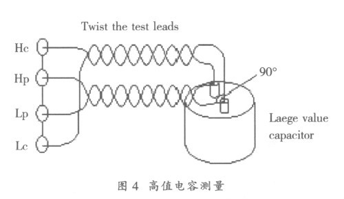 在電容器的測(cè)量中, 應(yīng)注意的事項(xiàng)與被測(cè)電容量有關(guān), 高值電容測(cè)量屬于低阻抗測(cè)量, 因此必須把接觸電極、測(cè)試夾具和電纜中的接觸電阻及殘余阻抗減到最低, 應(yīng)使用4 端、5 端或4 端對(duì)配置把DUT 接到儀器上。在使用4 端和5 端配置時(shí), 必須確保高測(cè)試信號(hào)電流流過(guò)電纜, 為避免電磁場(chǎng)耦合的影響, 按圖4 所示的方式來(lái)連接電纜;此外, 為進(jìn)行精確測(cè)量, 應(yīng)正確使用開(kāi)路、短路補(bǔ)償。特別是對(duì)于施加直流偏置電壓的電解電容器,應(yīng)在直流偏置設(shè)置為ON (0 V) 時(shí)進(jìn)行開(kāi)路/短路補(bǔ)償。