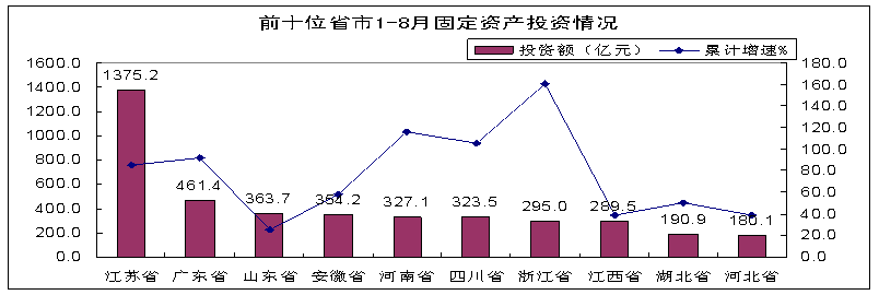 前8個月,東部地區(qū)完成投資3558億元,同比增長75.9%,增速高于去年同期33.6個百分點;江蘇、廣東、浙江、北京投資上升較快,增速超過80%,特別是江蘇省完成投資1375億元,占全國總投資的四分之一。中部地區(qū)完成投資1472億元,同比增長58.4%,其中河南投資增長較快,增速均超100%。西部地區(qū)投資慢于中東部,完成投資572億元,同比增長47.2%,其中四川省投資323.5億元,占西部地區(qū)的57%,同比增長105%。