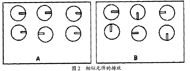 2)相似的元件在板面上應(yīng)以相同的方式排放。例如使所有徑向電容的負極朝向板件的右面,使所有雙列直插封裝(DIP)的缺口標記面向同一方向等等,這樣可以加快插裝的速度并更易于發(fā)現(xiàn)錯誤。如圖2示,由于A板采用了這種方法,所以能很容易地找到反向電容器,而B板查找則需要用較多時間。