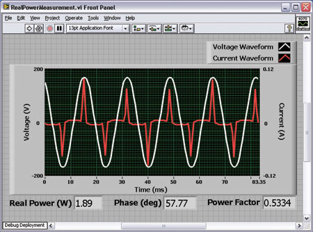 功率損耗的更精確描述可以通過測量設備的真實功率,或“近似功率”獲得,這種測量必須考慮信號的波形和相位。分析真實功率的方法之一是使用兩臺同步的PXI-4071 FlexDMM設備,每臺都具有采集電壓和電流波形速率高達1.8Ms/s的能力,并提供標準DMM的讀數方式。