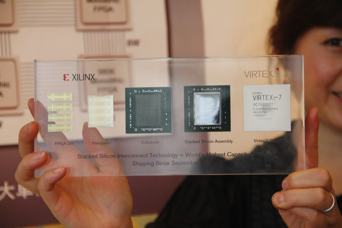 Virtex-7 2000T中采用的SII技術(shù),就是在無源硅中介層上并排連接著幾個(gè)有源硅切片,該切片再由穿過該中介層的金屬連接,與印制電路板上不同 IC 通過金屬互聯(lián)通信的方式類似。Virtex-7 2000T中包含了4個(gè)切片,因此其容量是市場(chǎng)同類最大28nm 器件的兩倍,而且比Xilins大型的Virtex-6 FPGA大2.5倍。