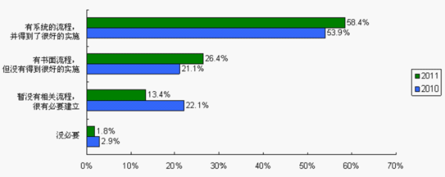 供求雙方把伙伴關(guān)系建立在專業(yè)評估的基礎(chǔ)上,通過系統(tǒng)流程可以有效減少供應(yīng)商認證和引入過程中的不合理操作、暗箱操作、防范采購風險、提高采購效率。在供應(yīng)商認證與引入過程中,沒有建立和認為沒必要建立系統(tǒng)流程的受訪者比例由2010調(diào)查的25%(22.1%+2.9%)降至2011調(diào)查的15.2%(13.4%+1.8%),已經(jīng)建立流程并且得到很好實施的比例也由2010調(diào)查的53.9%上升至2011調(diào)查的58.4%。