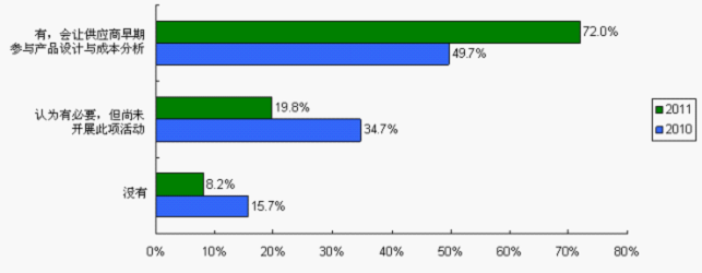 讓供應(yīng)商參與早期的產(chǎn)品設(shè)計是增進供求雙方伙伴關(guān)系的途徑之一,借助供應(yīng)商的技術(shù)優(yōu)勢,挖掘元器件成本空間,從而提高產(chǎn)品競爭力、加快產(chǎn)品上市、降低成本。讓供應(yīng)商早期參與產(chǎn)品設(shè)計與成本分析由2010調(diào)查的49.7%大幅上升至2011調(diào)查的72%,而其中69.2%是主芯片供應(yīng)商的參與,30.8%是被動元件供應(yīng)商的參與。