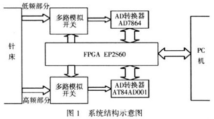 本自動測試系統(tǒng)的結構框圖見圖1。系統(tǒng)的工作原理是:通過針床將待測信號導出,F(xiàn)PGA 通過控制多路模擬開關將待測信號采集進來,將數(shù)據(jù)通過相應協(xié)議傳送到PC 機,用自動測試軟件測試各個信號是否正常。