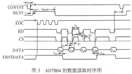 (1)低頻部分。本部分主要采集的是電源信號和電平變換信號,采用AD7864 作為采集芯片。AD7864 具有片內時鐘、讀寫允許邏輯、多種通道選擇方式以及內部精確的2。5 V 參考電壓,這使得其與高速處理器的接口變得非常簡單。AD7864 轉換后的數(shù)據(jù)讀取采用轉換后讀取數(shù)據(jù)的方式,其讀取時序見圖3。