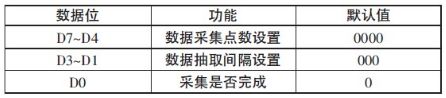 其中D7~D4 為數(shù)據(jù)采集的點數(shù)設置,3333B 表示64 個,1111 表示1 324 個,步進為64。D3~D1 為數(shù)據(jù)抽取的間隔設置,333 表示抽取間隔為3,全部數(shù)據(jù)有效;111 表示抽取間隔為28,即每隔28 個點抽取一個點,步進為4。設置這幾位的目的是為了適應信號頻率的要求,防止采集數(shù)據(jù)不足一周期的狀況發(fā)生。D3位為標志位,功能和操作與5 bit 的寄存器的對應位完全相同。本寄存器分高4 位和低4 位兩次設置。