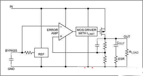低壓差線性穩(wěn)壓器(LDO)的結構主要包括啟動電路、恒流源偏置單元、使能電路、調整元件、基準源、誤差放大器、反饋電阻網絡,保護電路等,基本工作原理是這樣的:系統(tǒng)加電,如果使能腳處于高電平時,電路開始啟動,恒流源電路給整個電路提供偏置,基準源電壓快速建立,輸出隨著輸入不斷上升,當輸出即將達到規(guī)定值時,由反饋網絡得到的輸出反饋電壓也接近于基準電壓值,此時誤差放大器將輸出反饋電壓和基準電壓之間的誤差小信號進行放大,再經調整管放大到輸出,從而形成負反饋,保證了輸出電壓穩(wěn)定在規(guī)定值上;同理如果輸入電壓變化或輸出電流變化,這個閉環(huán)回路將使輸出電壓保持不變,即: