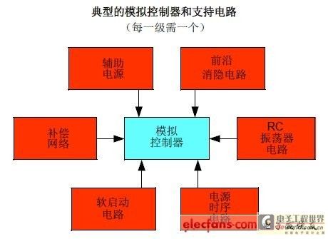 圖1和圖2僅從較高層次展示了兩者的主要差別;然而,在進(jìn)行對(duì)比時(shí)所有支持電路也需包括在內(nèi)。圖3 所示為每個(gè)模擬級(jí)中的支持電路,而圖4 則為數(shù)字系統(tǒng)中的支持電路。注意模擬控制器所需要的額外連接(在圖3 和圖4 中用箭頭標(biāo)出)。